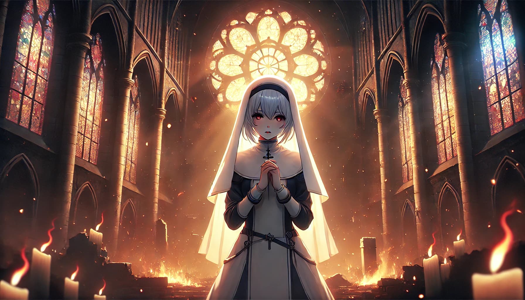 聖陽教会の名前からも明らかなように、炎=光=正義という構図が作品全体に存在し、そこに“アドラの炎”という別種の炎が混じり込むことで、「光であったはずのもの」が歪むという演出が重なります。